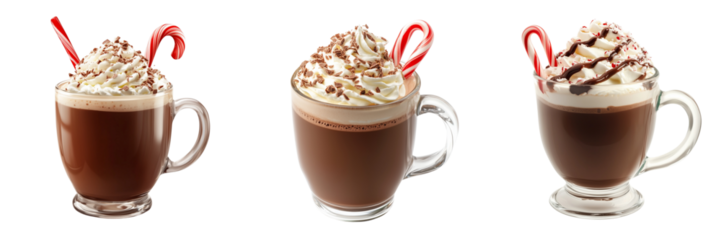 Set of A tall glass mug of peppermint mocha topped with whipped cream and crushed peppermint candy on transparent png background
