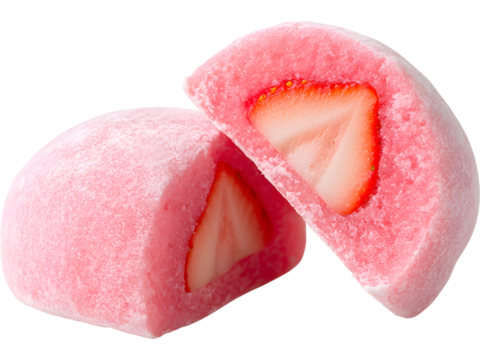 Pink strawberry mochi dessert isolated on transparent background, representing sweet Japanese confection.
