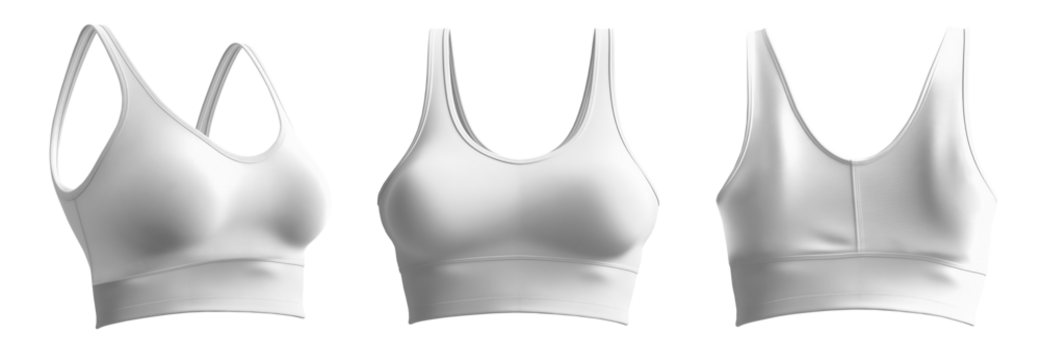 Set of white front back side view, sports exercise bra tank crop top on transparent background cutout, PNG file. Mockup template for artwork graphic design