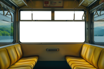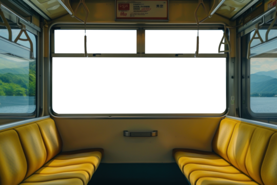 Airplane window with transparent background, perfect for showcasing landscapes or adding a travel theme to designs