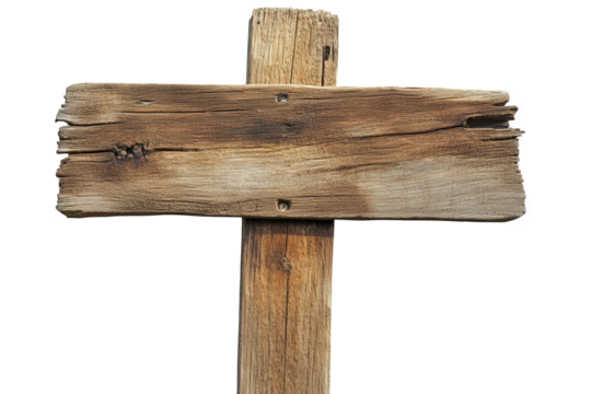 Rustic wooden sign isolated on transparent background, weathered and aged, perfect for adding a touch of vintage charm to your designs with its natural wood grain texture