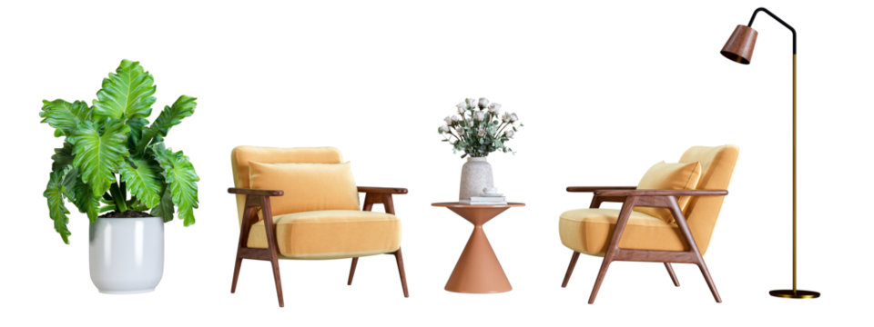 Side view of round table with flower vase and two white chairs for modern cafe or dining setup isolated on transparent background
