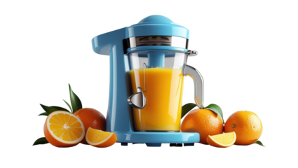 A vibrant blue juice extractor stands beside fresh, sliced oranges against a black background.