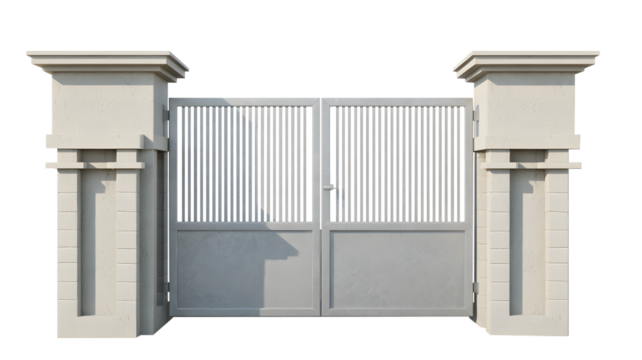 White gate with vertical bars and stone pillars architectural