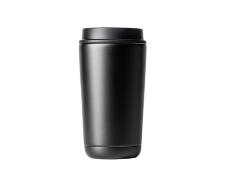 Elegant black travel mug, perfect for coffee or tea on the go. Versatile design for modern lifestyles. Ideal for use at home or office.