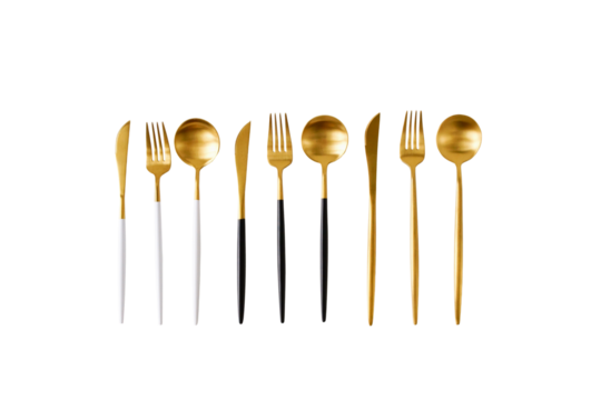 Golden cutlery set arranged on a black plate is isolated on transparent background, creating an elegant and modern dining setting