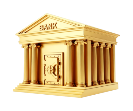 Luxurious golden bank building with a secure vault door and classical columns symbolizes wealth, security, and financial stability in a modern economy.