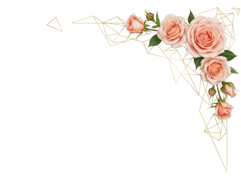 Modern geometric floral corner with peach roses and gold lines isolated on white background