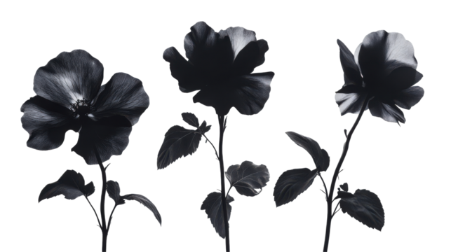 Dark floral elegance Three hibiscus blooms in silhouette art, monochrome botanical beauty, minimal aesthetic against a white background, modern floral print.
