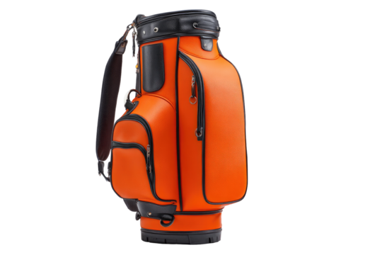 Bright orange golf bag with black accents.  Features multiple pockets and compartments.  Solid construction