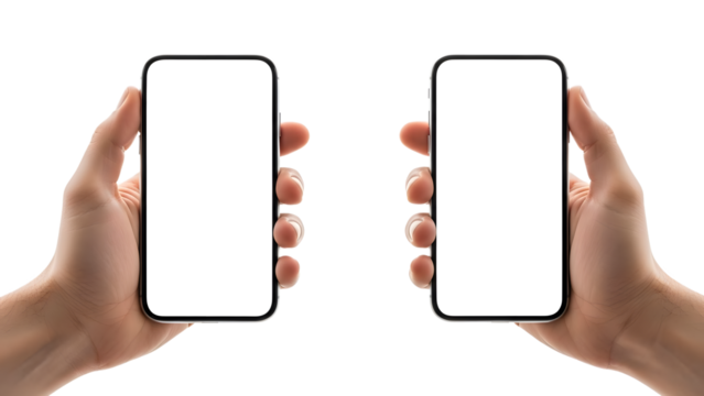 three hands holding modern smartphones with blank screens isolated on transparent background