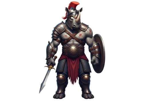 A powerful rhino warrior, clad in intricate metal armor, stands ready with sword and shield against a stark black backdrop.