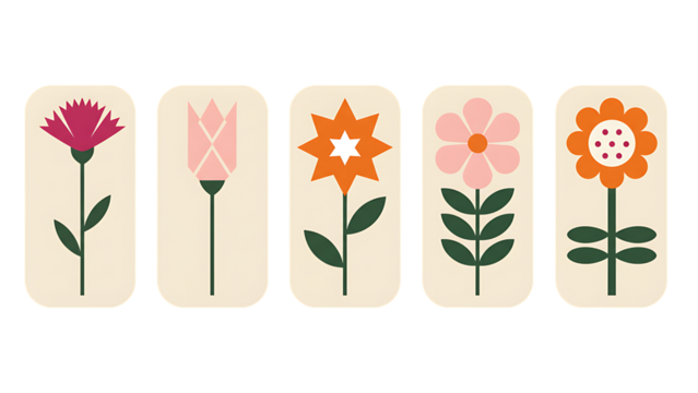 Five stylized floral illustrations arranged in a row on transparent background