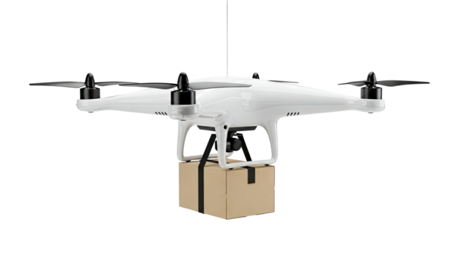 White drone carrying a cardboard package