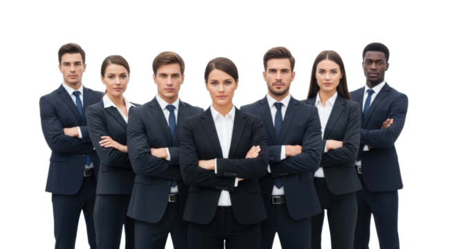 Lineup of business professionals standing in a row, full height view, facing camera, isolated on transparent background.