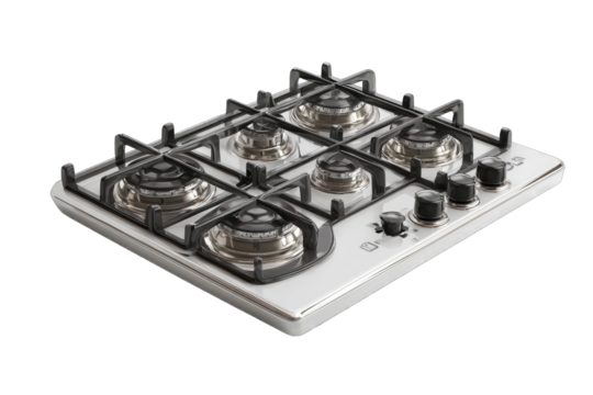A white gas stovetop with six burners, metal grates, and knobs.  It's angled slightly, showing the controls and burners