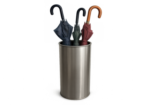 Decorative umbrella stand featuring multicolored umbrellas, adding visual interest and practical rainwear storage near entryway
