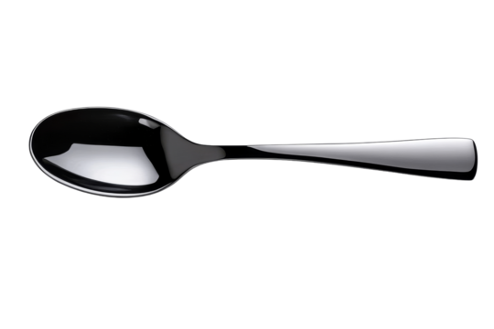 A sleek black spoon rests on a stark white surface