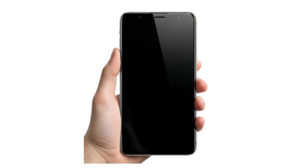 Hand holding a modern smartphone with a blank white screen isolated on a transparent background