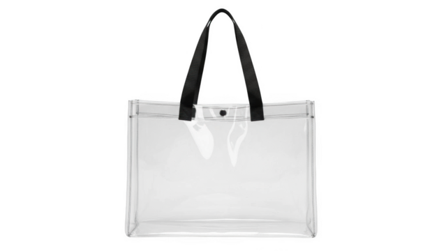 Clear transparent tote bag with black handles on black background plastic