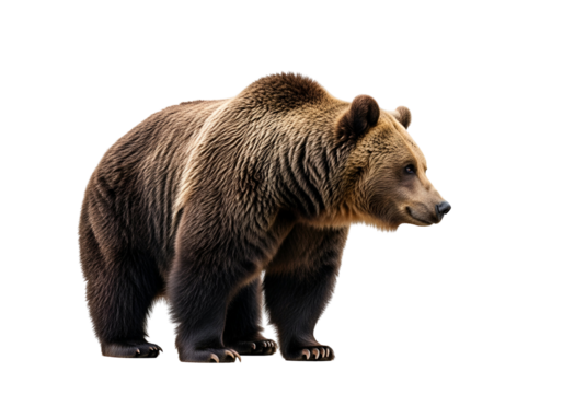 A profile view of a large brown bear, presented against a stark black backdrop, highlighting its rich fur and powerful stance.