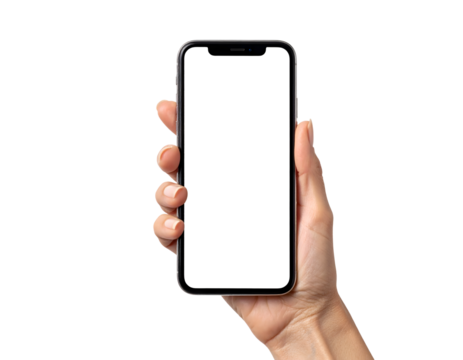 Closeup of a persons hand holding a modern smartphone with a blank white screen isolated on transparent background transparent background