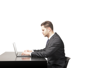 A man in a suit focused on typing on a laptop at a desk, isolated on a white background. Concept of professionalism, productivity, and work