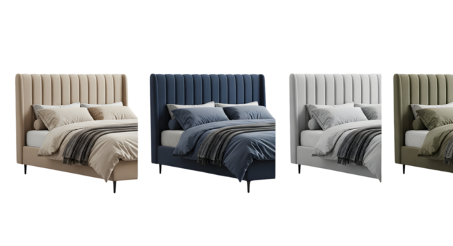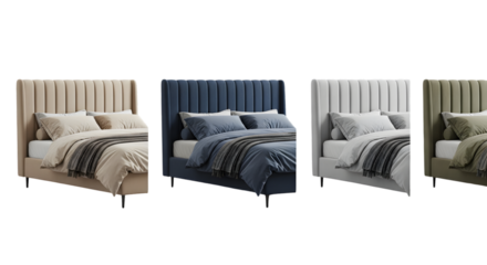 Group of four luxurious upholstered beds in different color options: beige, deep blue, crisp white, and earthy green, isolated on black.
