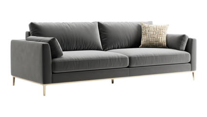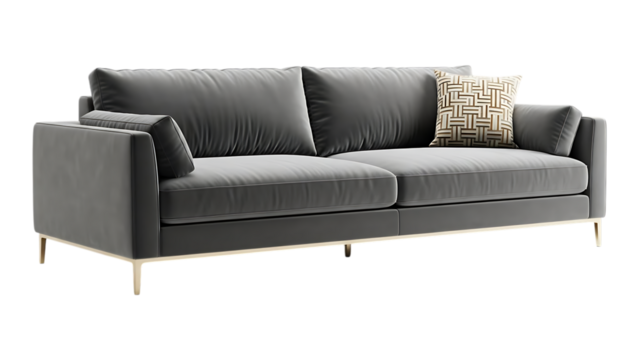 modern luxury gray leather sofa with gold trim and patterned accent pillow on transparent background