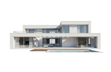 modern house, white in color with glass windows and a terrace, on a transparent background in a cutout png style,