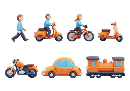 3d clay style icon set of 3d cartoon icons showing various modes of transportation, isolated on a transparent background