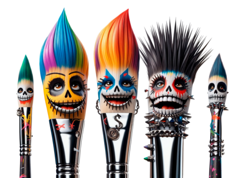Creative concept image of punk rock style paintbrushes with colorful bristle hairstyles and skull faces. Each brush is uniquely styled with vibrant colors, piercings, and expressive personality