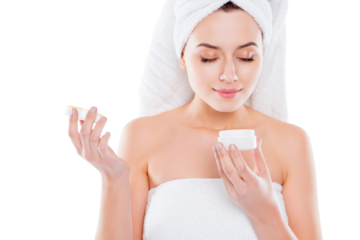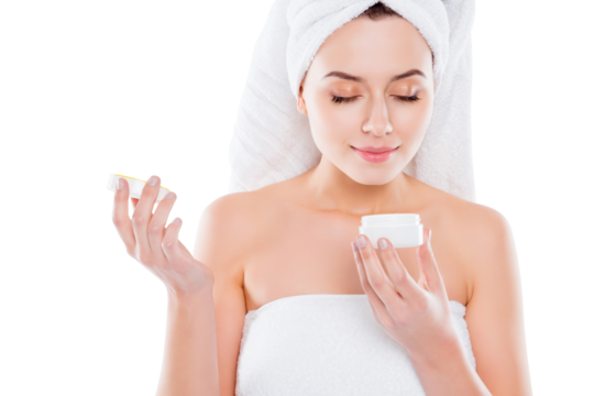 Portrait of lovely woman in towel and turban on head, holding cream for problem combined face skin enjoying smell with close eyes isolated on white background