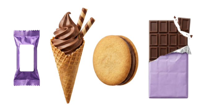 assorted sweet treats and snacks including chocolates cookies ice cream cone isolated on