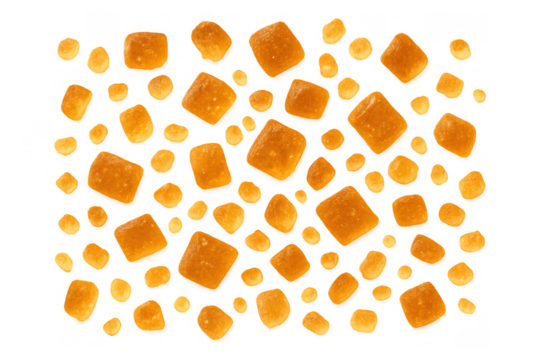 Caramel candy cubes and small spheres scattered, creating a sweet food pattern on a transparent background