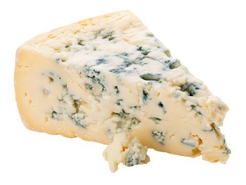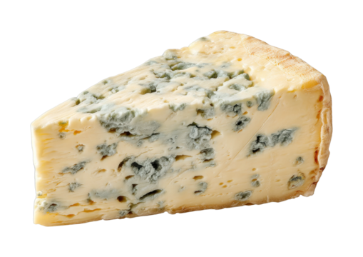 Wedge of creamy blue cheese with moldy blue veins isolated on a white background close-up