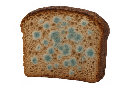 Moldy bread slice showing green fungus growing on spoiled food surface, representing decay and inedible old produce