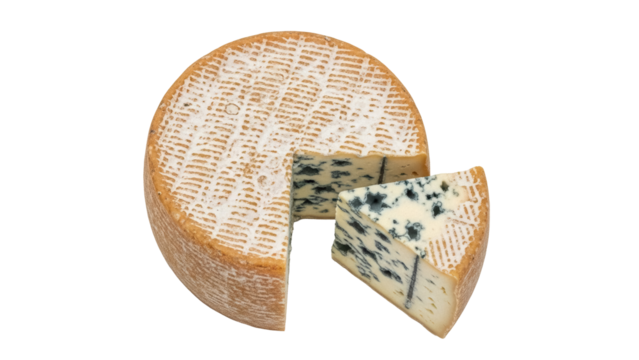 Delicious Fourme de Montbrison cheese wheel with a cut piece isolated PNG, creamy blue cheese with mold for gourmet food and culinary use