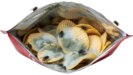 Unappetizing open bag of potato chips with mold and flies, depicting spoilage and poor food hygiene