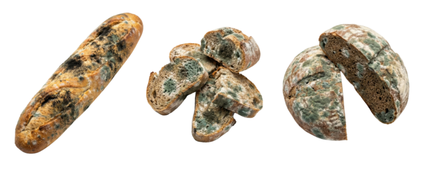 Moldy bread loaf and slices isolated on transparent background