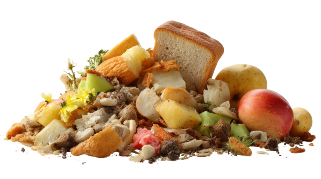 Pile of rotting moldy food scraps including fruits, vegetables and bread on transparent background for composting and waste concepts.