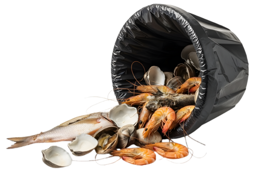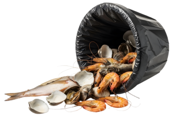 A restaurant trash can filled with rotten fish and moldy clams highlights environmental pollution.