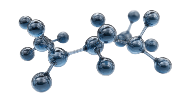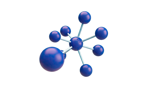 A 3D atom molecule model with connected spheres and bonds, isolated on a white or transparent  png background, symbolizing science, chemistry, and structure.