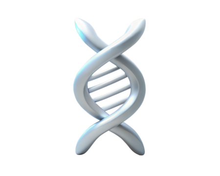 A futuristic, holographic 3D icon of a DNA spiral, featuring smooth, reflective surfaces and a twisting design, isolated on white background. Ideal for biotechnology, genetics, and modern science