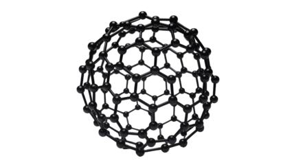 A 3D rendered graphic depicting a molecular structure. Spherical nodes are connected by white rods, set against a black backdrop