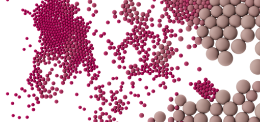 A dense cluster of textured, spherical objects varying in shade from light gray to dark, resembling tiny celestial bodies or a microscopic cellular structure