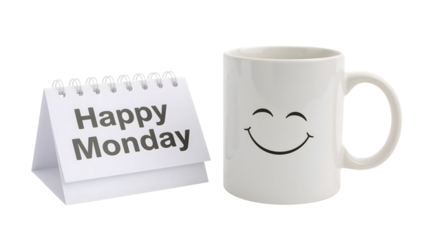 Happy monday motivation with smiling mug and desk calendar isolated on the transparent background for positive start