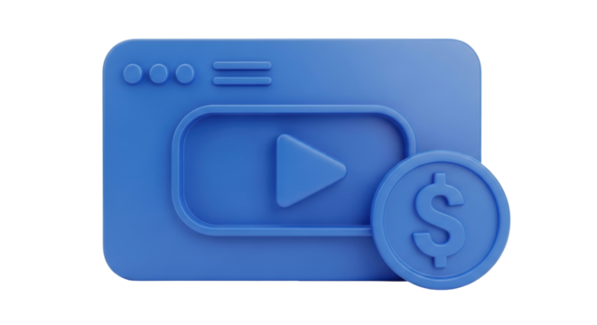 Isolated 3D render of a video player window with a dollar coin, symbolizing online monetization