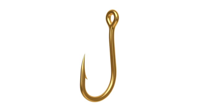 A gleaming golden fishhook symbolizing temptation and allure poised against an endless void on transparent background