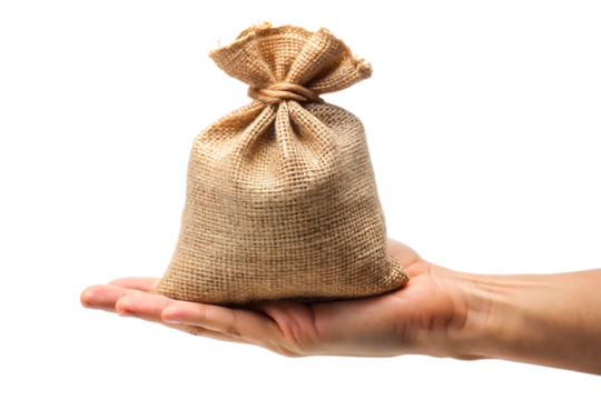 Hand holding bag sackcloth, isolated on white background.png